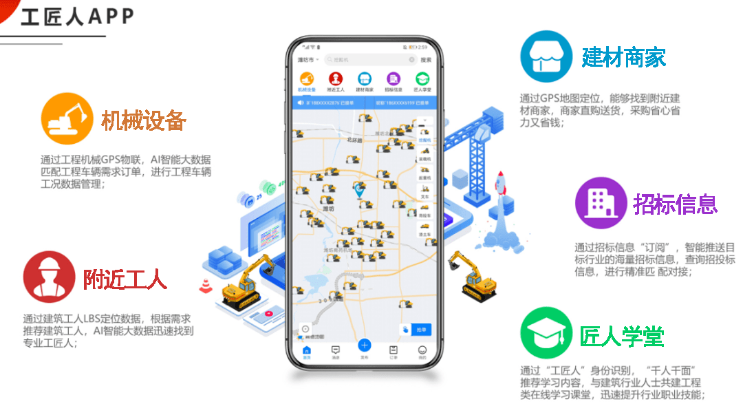 工匠人自主研发的智能云盒设备,不仅实现了车辆实时定位、工作状态显示、工作时长统计、电子围栏报警、行车轨迹回放、车速油耗监测、影音监控等8大车辆功能,更实现了车辆在地图实时展现自己的相关信息,系统自动智能派单,车辆在线接单抢单,足不出户找活揽工程的功能,解决了传统行业供需不匹配的就业问题。